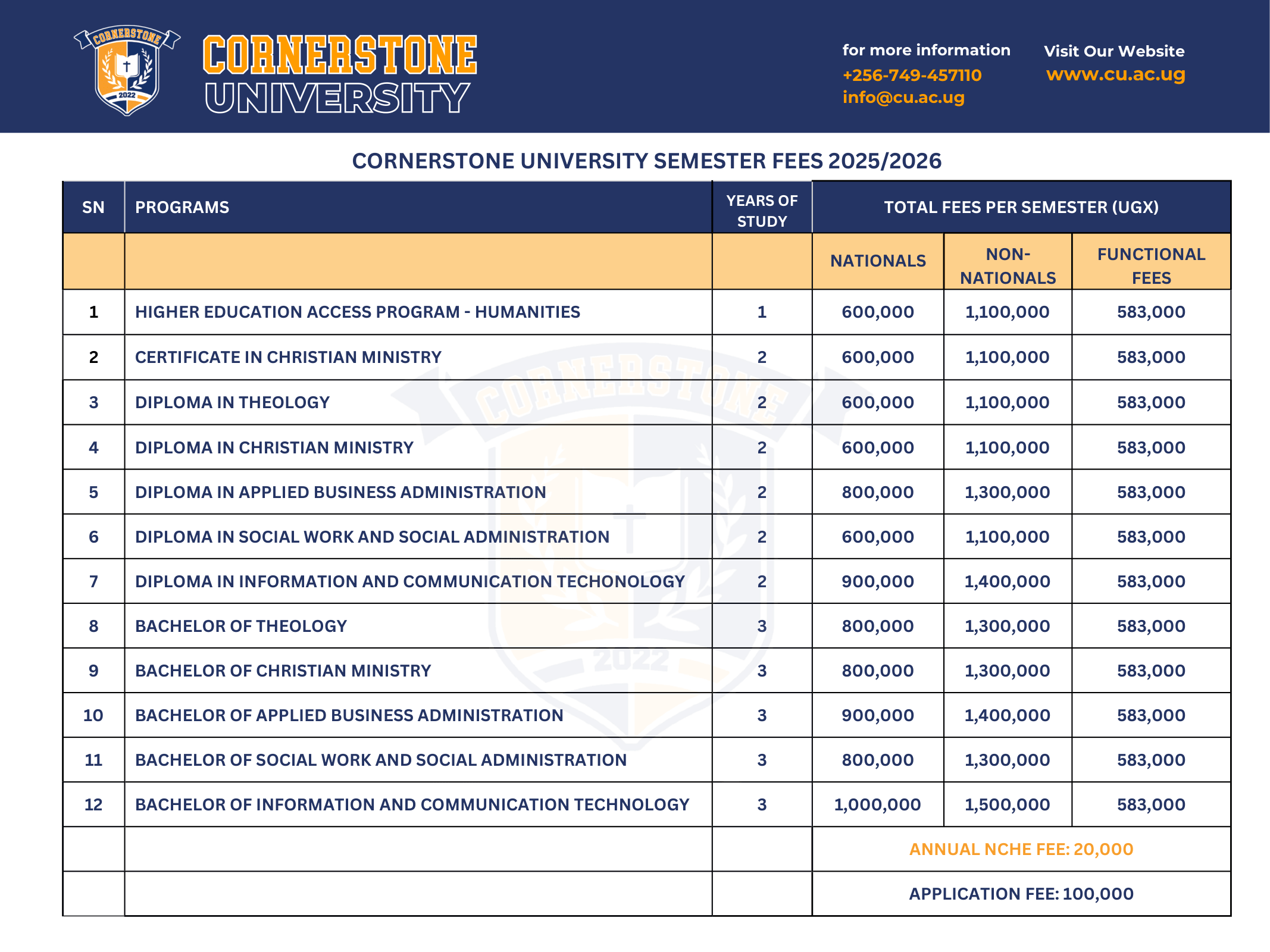 At Cornerstone University, we are committed to delivering high-quality, Christ-centered education at a cost that is accessible and transparent. Below is the detailed fee structure for both national and international students.
